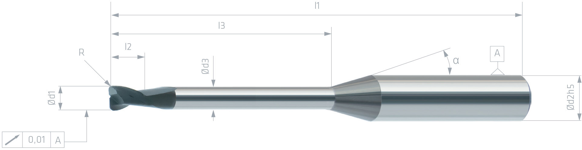 | Verkaufsbezeichnung: | VHM-Eckenradiusfräser Ø3x3-SchaftØ6h5x100-FLØ2.9x45 Z2-R0.3-Helix30°-WEDT |