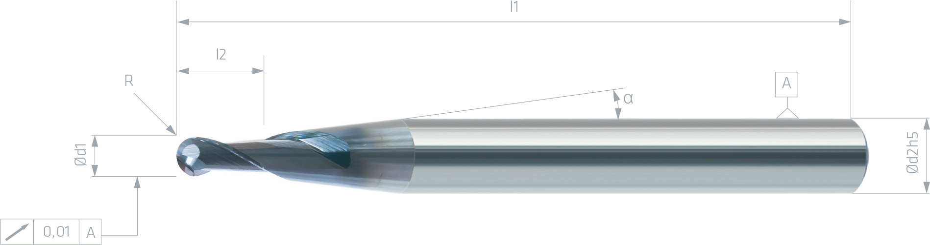 | Verkaufsbezeichnung: | VHM-Kugelfräser Ø5x8-SchaftØ6h5x64 Z2-R2.5-Helix30°-WEAD |